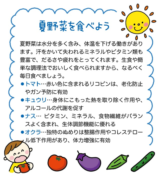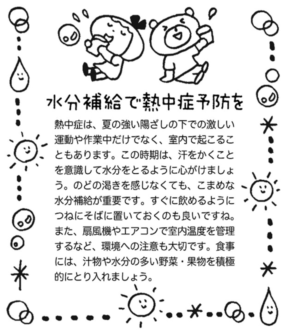 暑い日が続き、食欲が低下しやすい時期でもありますが、1日3食バランスよく、食事をとっていきましょう。そして、脱水症状にならないためにも、水分をこまめにとりましょう。